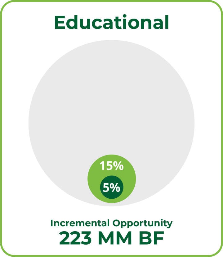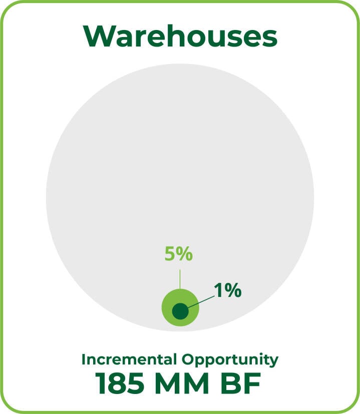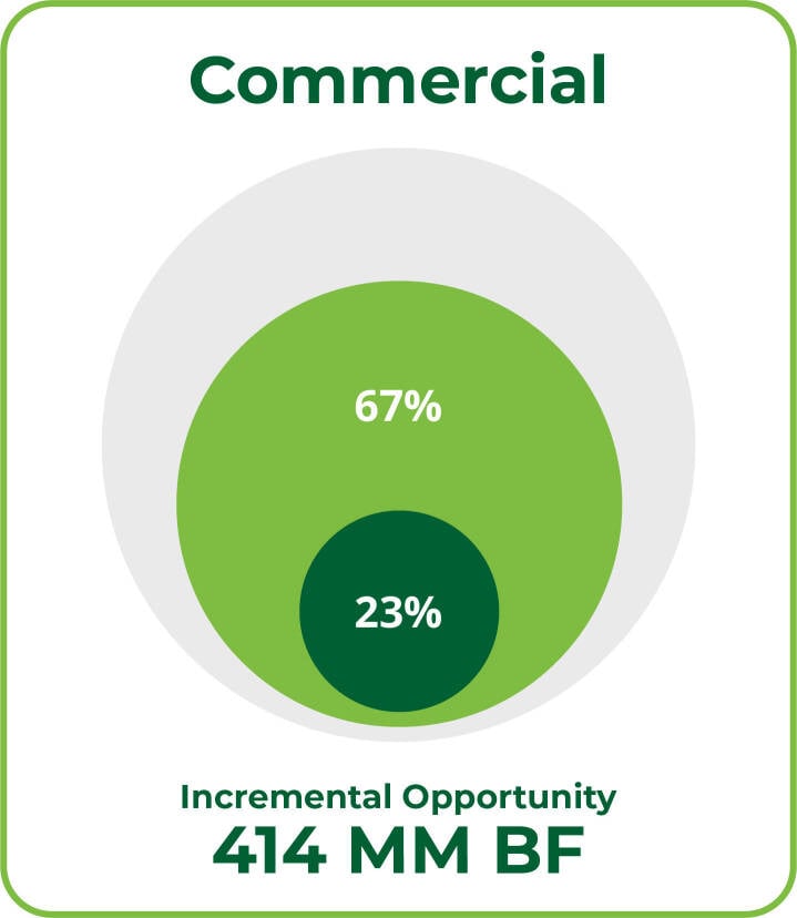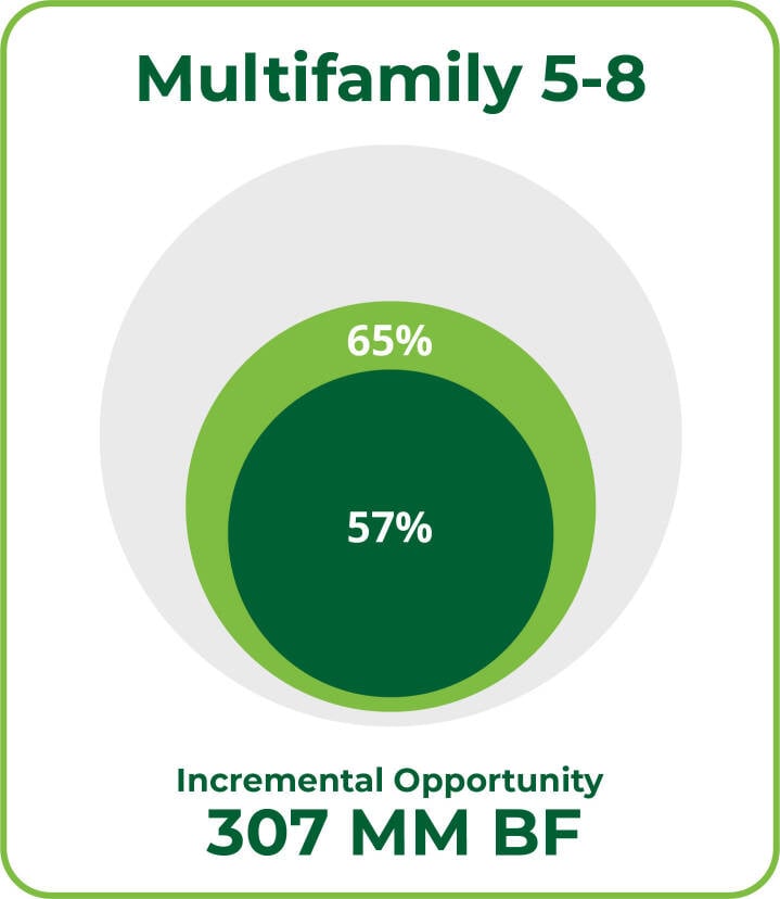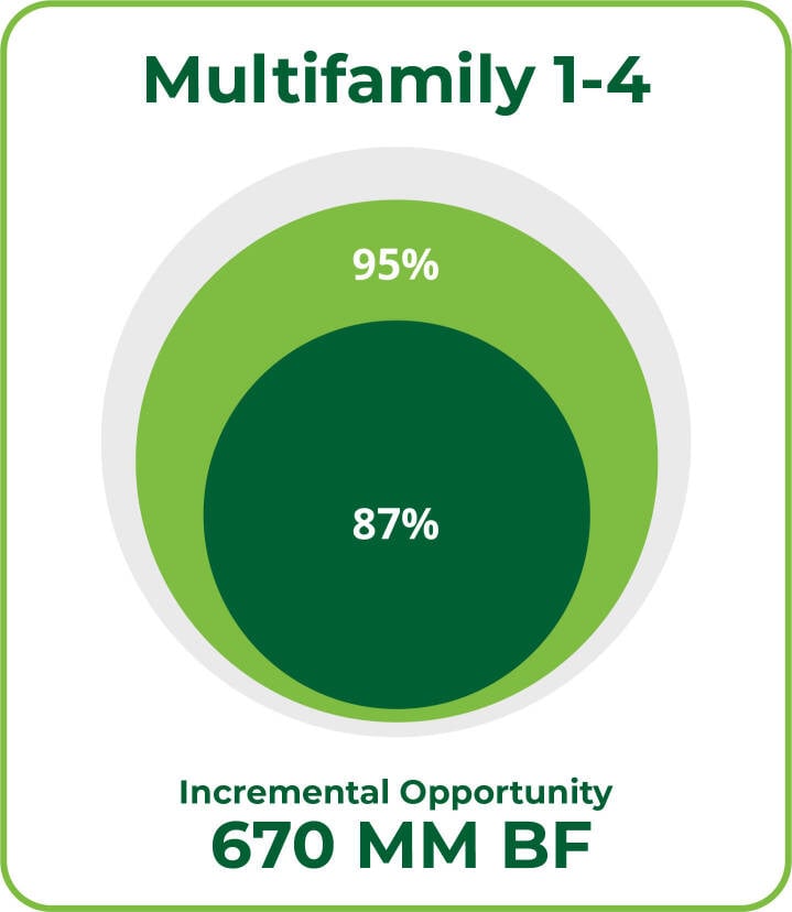 Multifamily 1- to 4-story remains the largest incremental opportunity, representing 670 MM BF in potential annual volume. Urban infill, zoning reform, and “Missing Middle” housing policies create room for expansion even as lumber maintains a strong share.