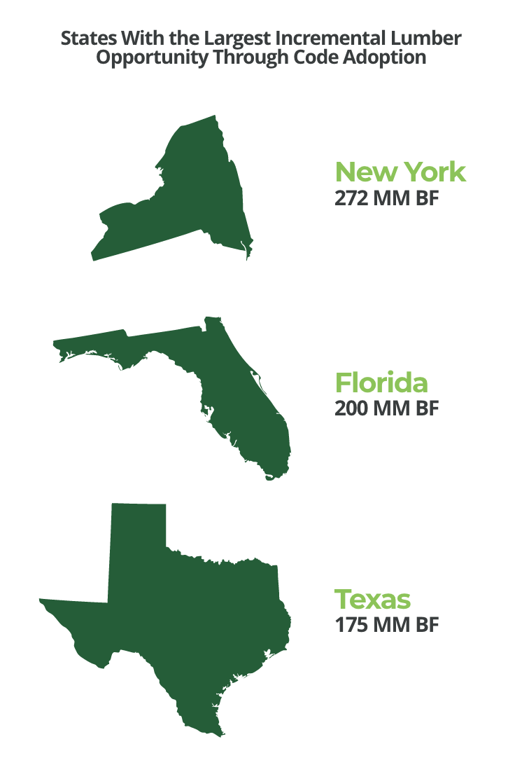 Continuing outreach to encourage more states and localities to adopt the tall mass timber provisions is vital to increasing the market opportunity for softwood lumber. Notably, states that have not yet